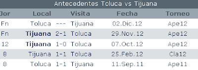 La historia previa de los partidos entre los Diablos de Toluca vs Xolos se ha dado unicamente durante la Apertura 2012. Dichos equipos se han enfrentado en cuatro ocasiones con 2 empates y dos triunfos para Xolos.