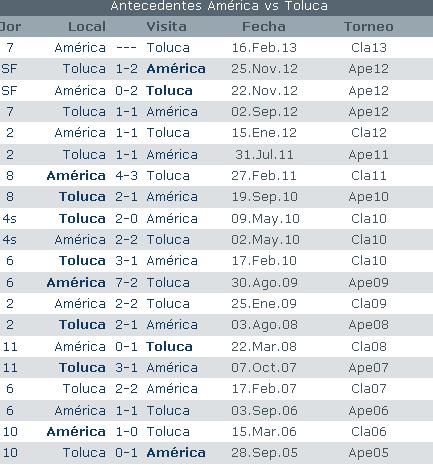 Toluca por su lado viene en mal momento ya que se ubica en el lugar 15 con apenas 5 puntos (1-2-3) contando con 5 goles a favor y 9 en contra, los choriceros vienen de una dolorosa derrota en su casa por 4 a 1 ante los Tigres quienes les rompieron una hegemonía de casi 10 años, el cuadro choricero es el actual subcampeón del Futbol Mexicano pero este torneo a pesar de haberlo iniciado bien ha caido en un bache. América sin duda es el favorito.